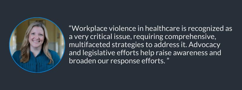 Violence in healthcare has reached a crisis point, impacting not only the safety of employees but also the overall quality of care provided to patients. Jennifer Schmitz described the timeliness of the conversation and a recent sense of urgency to address the issue, stating that now “workplace violence in healthcare is recognized as a very critical issue, requiring comprehensive, multifaceted strategies to address it.” She adds that “advocacy and legislative efforts help raise awareness and broaden our response efforts.”